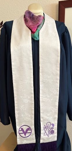 This Reversible Medium Custom stole measures 41.5 x 4.5" measured from the nape of the neck to the end of the white fringe. It features a rounded neck and has white brocade on the front side and purple brocade on the reverse. . The Science of Mind and Oneness Symbols are embroidered on both the front and back...white embroidery on the front and purple on the back. Purple fringe at each end.