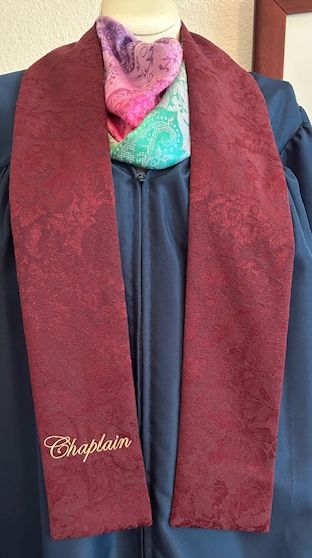 This delightful Oneness Chaplain stole is the smallest of our line of ceremonial stoles and measures 27 inches from the nape of the neck to the end by 4 inches wide. It is made with antique jacquard brocade fabric and gold satin lining. The Oneness Symbol is embroidered at the top (apex) of the stole. At the right end of the stole is embroidered the word "Chaplain."